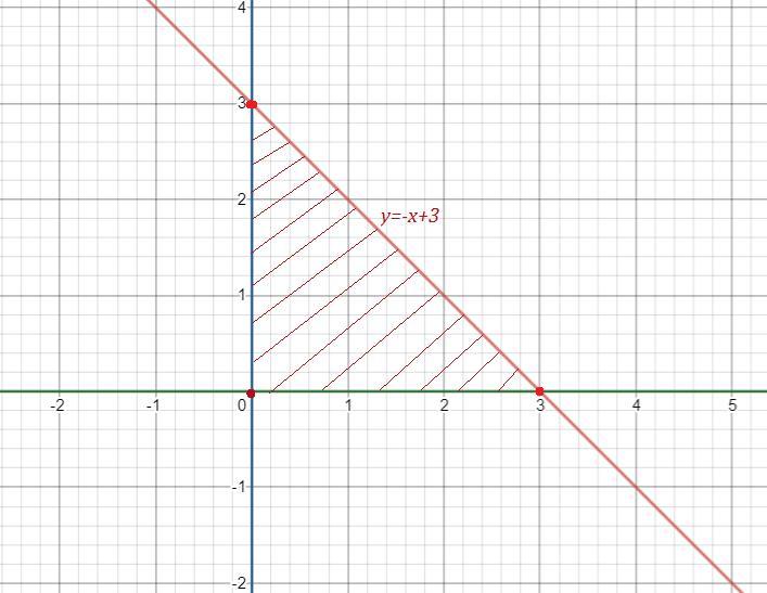найдите площадь криволинейной трапеции, ограниченную осью Ox и прямой x = 0 в графике функции y = - x + 3.