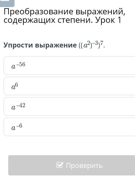 Объяснение: Если степень стоит возле скобки, степени внутри скобки умножают на степень снаружи скобки. Таким образом 2*-3*7=-42