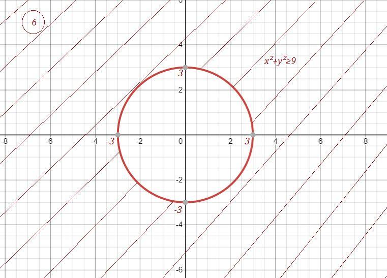 часть плоскости, лежащая вне окружности с центром в точке (0;0) и радиусом R=3, граница области входит в неё .