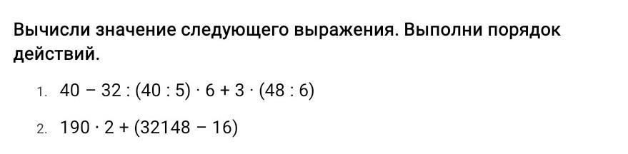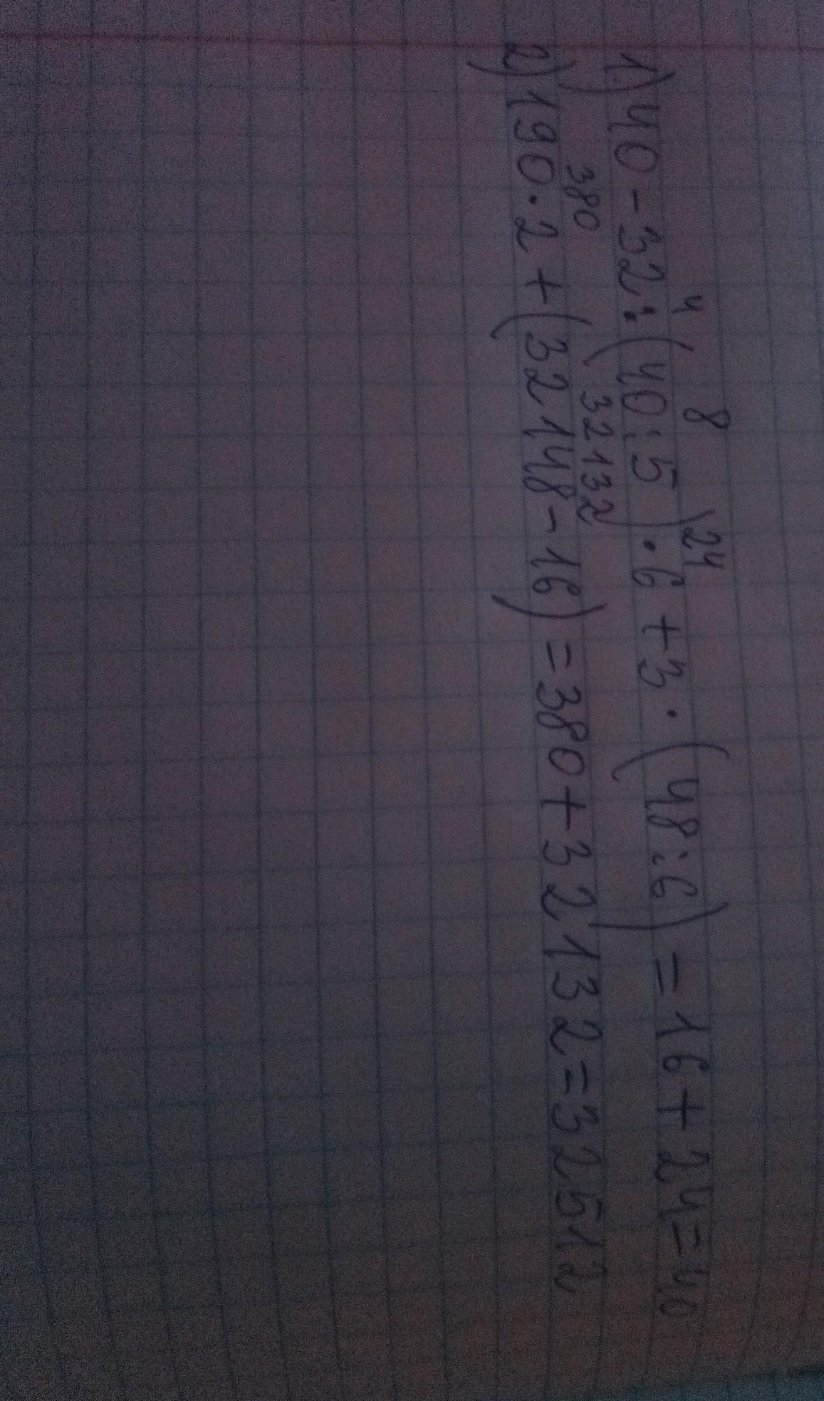 Вычесли значение сдающего вырождения Выполнил порядок действий 40-32:(40:5) *6+3*(48:6)