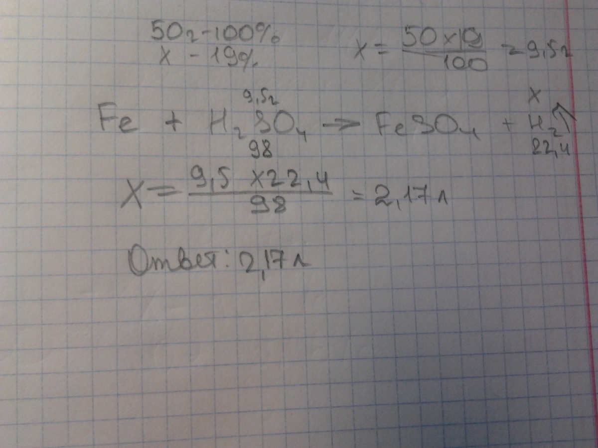 определите объем водорода ,который выделится при взаимодействии железных опилок с 50 г 19%-ного раствора серной кислоты
