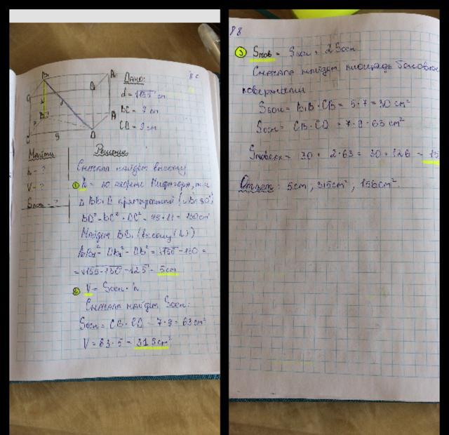 Диагональ прямоугольного параллелепипеда равна ^155 см. Стороны основания 7см и 9см. Найдите высоту, объем и площадь полной поверхности параллелепипеда.