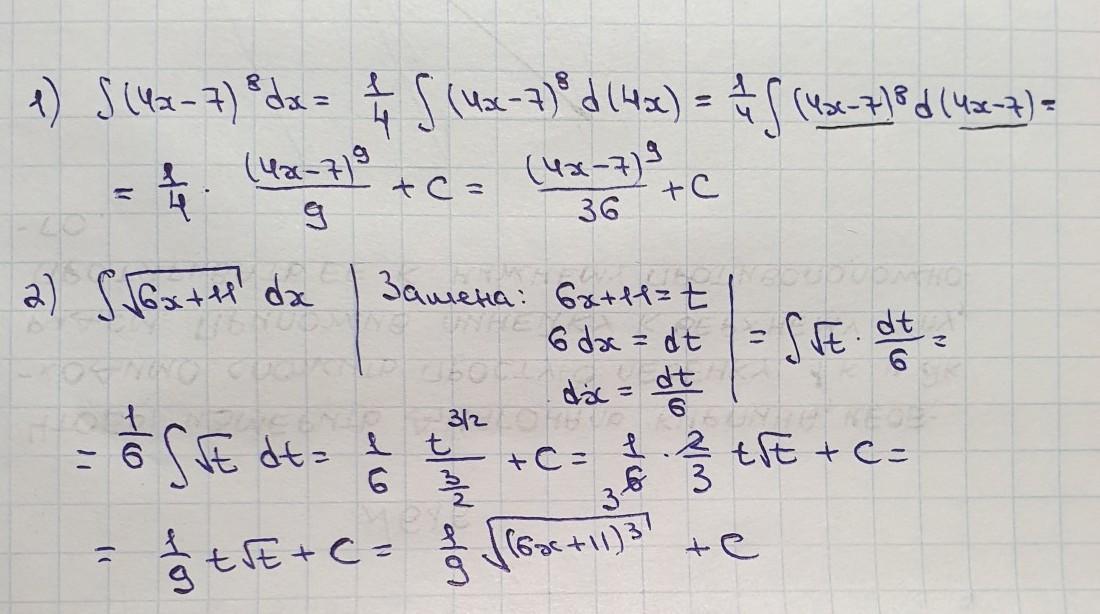 в первом в dx x преобразуем в (4х-7) для того, чтобы проинтегрировать это выражение как одну переменную (интеграл а = а^2/2) Для этого добавляем 1=1/4*4, и 4 сразу заносим под знак дифференциала (dx), и получается 1/4 остаётся за интегралом. Const (любое число) мы можем добавить "просто так", так как производная любого числа равно 0, и ничего не поменяется. и Дальше интегрируем выражение как единую переменную. Похожая ситуация в 3)