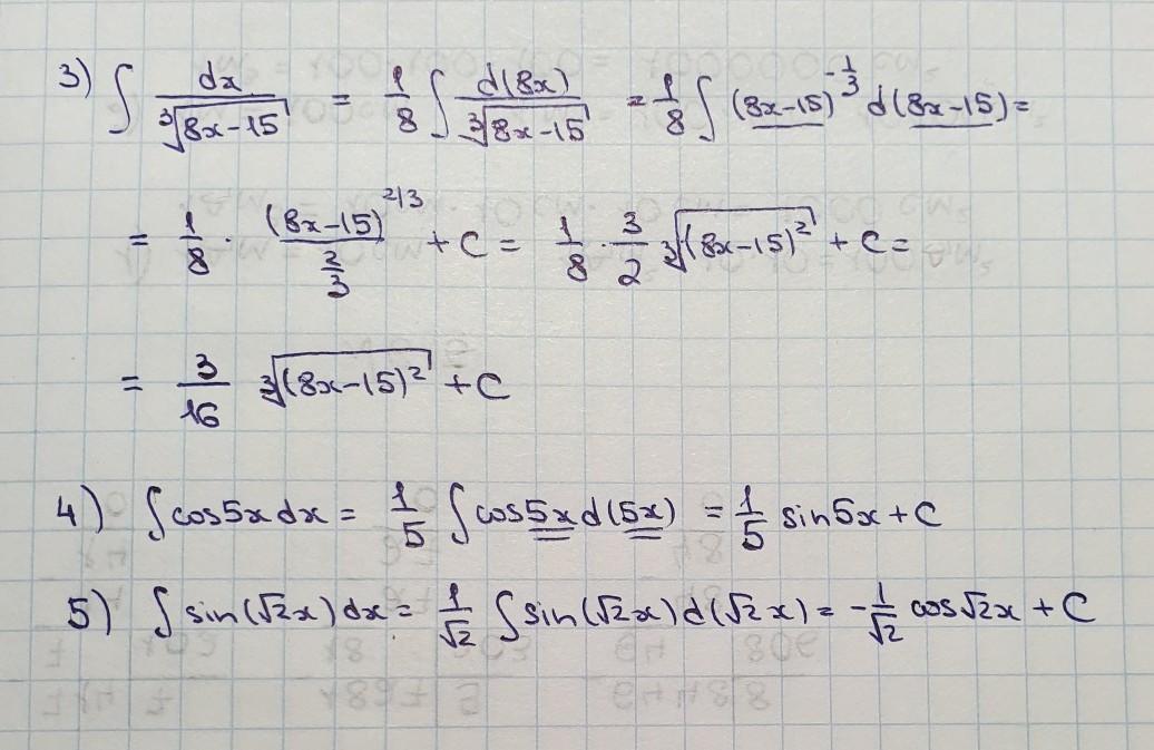 Во 2 делаем замену, в 4 и 5 также просто наносим под знак дифференциала число, чтобы можно было проинтегрировать.