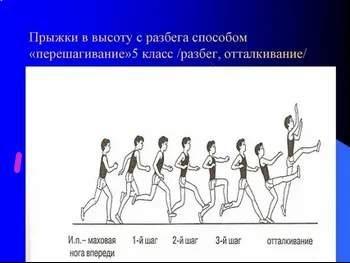перебегание трёх беговых шагов по разбегу с отталкиванием вверх вперед вдоль планки это упражнение для обучения техники...