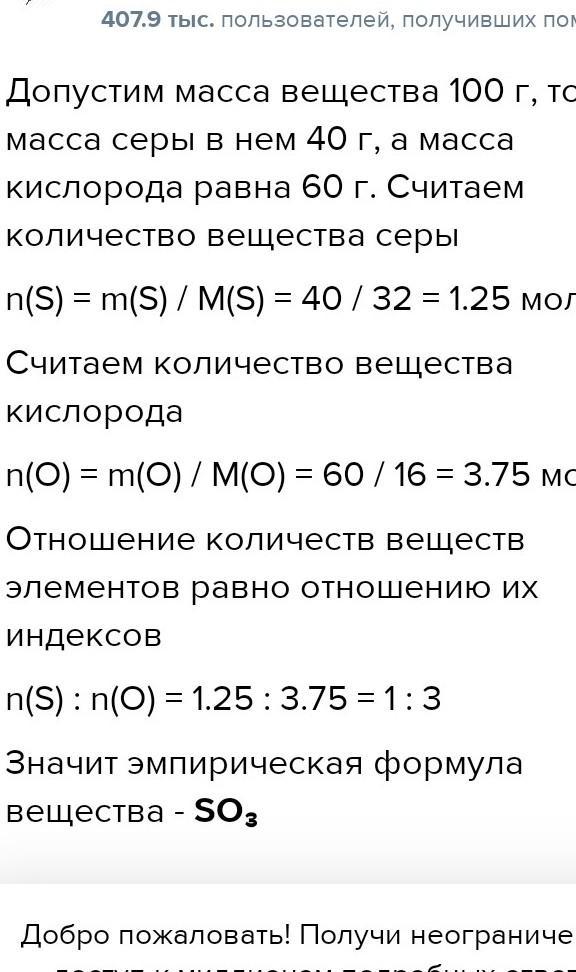 Определите простейшую химическую формулу вещества по данным анализа:массовая доля серы равна 40%,кислорода-60%