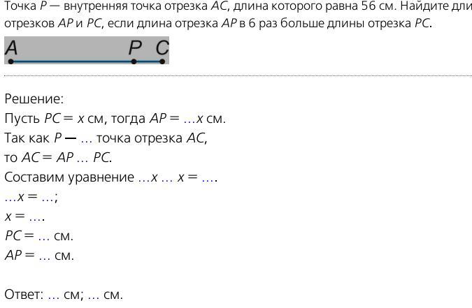 Точка P - внутренняя точка отрезка AC, длина которого 56см. Найдите длины отрезков AP и PC? Если длина отрезка AP в 6 раз больще отрезка PC.