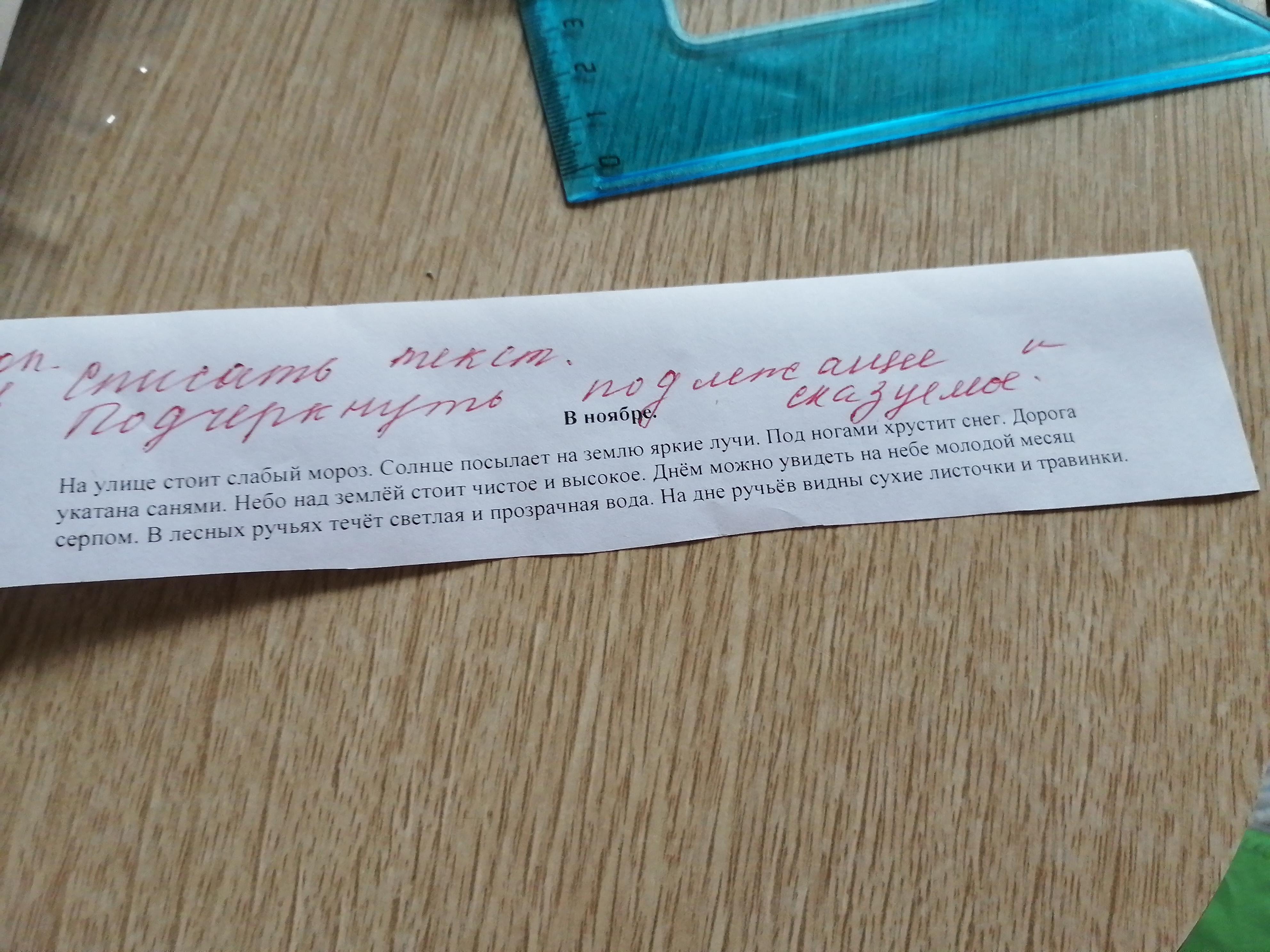 На улице стоит( сказуемое ) слабый мороз ( подлежащие). Солнце ( подлежащие ) посылает ( сказуемое ) на землю яркие лучи. Под ногами хрустит ( сказуемое ) снег ( подлежащие ). Дорога ( подлежащие ) укатана ( сказуемое ) санями. Небо ( подлежащие ) над землей стоит ( сказуемое ) чистое и вычокое. Днем можно увидеть ( сказуемое ) на небе молодой месяц ( подлежащие ) серпом. В лесных ручьях течет ( сказуемое ) светлая и прозрачная вода ( подлежащие ). На дне ручьев видны ( сказуемое ) сухие листочки ( подлежащие ) и травинки ( подлежащие ).