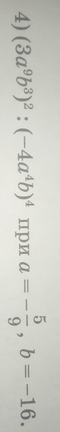 (3a^{9}b^{3})^{2}:(-4a^{4}b)^{4}=\frac{9a^{18}b^{6}}{256a^{16}b^{4}}=\frac{9}{256}a^{18-16}b^{6-4}=\frac{9}{256}a^{2}b^{2}\\\\a=-\frac{5}{9};b=-16\\\\\frac{9}{256}*(-\frac{5}{9})^{2}*(-16)^{2}=\frac{9}{256}*\frac{25}{81}*256=\frac{25}{9}=2\frac{7}{9}\\\\Otvet:\boxed{2\frac{7}{9}}