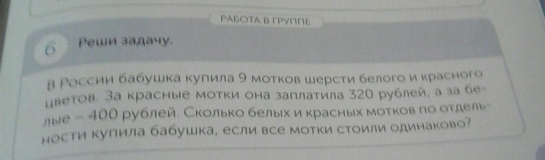 Ответ: 5 мотков белой шерсти и 4 мотка красной шерсти