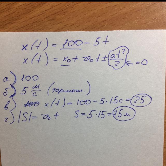 Движение тела задано кинематическим уравнением: x(t)=100-5t (м). Определите: а) начальную координату тела; б) проекцию и модуль скорости его движения; в) координату тела через 15 с; г) модуль его перемещения за 15с.