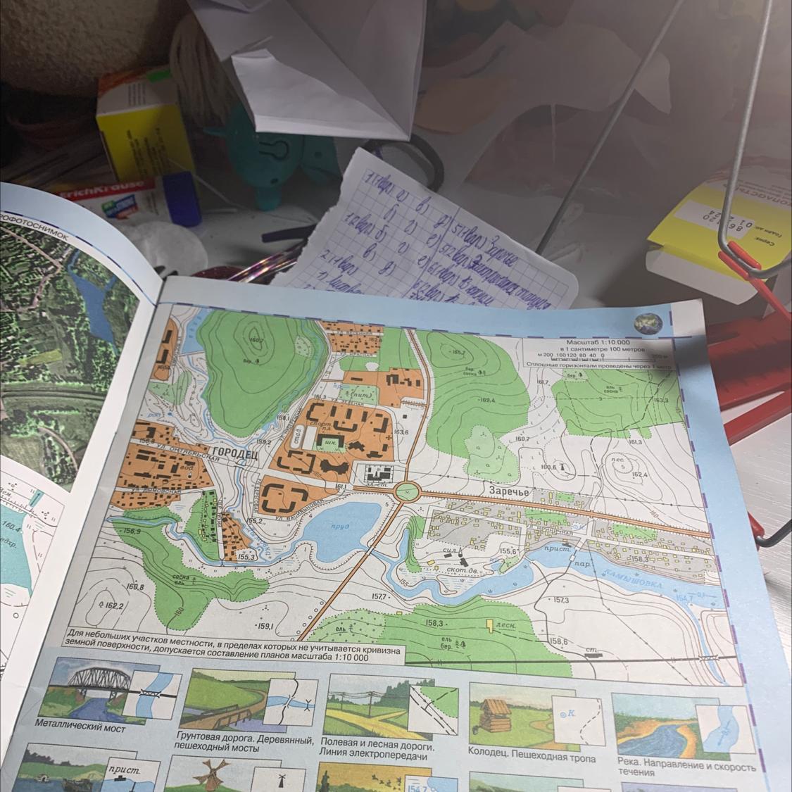 По ул.Октябрьской я прошла 280 м. по азимуту 280°.По пути я перешла по мосту реку Тихую.Вскоре показались дома микрорайона.Здесь я свернула на северо-запад и через 200 м. дошла до родника.(Ещё-Совершите воображаемое путешествие от плотины водохранилища до деревни Заречье. Выберите наиболее короткий или самый интересный,на ваш взгляд,маршрут. Опишите направление пути и объекты,которые вы встретите на дороге.)