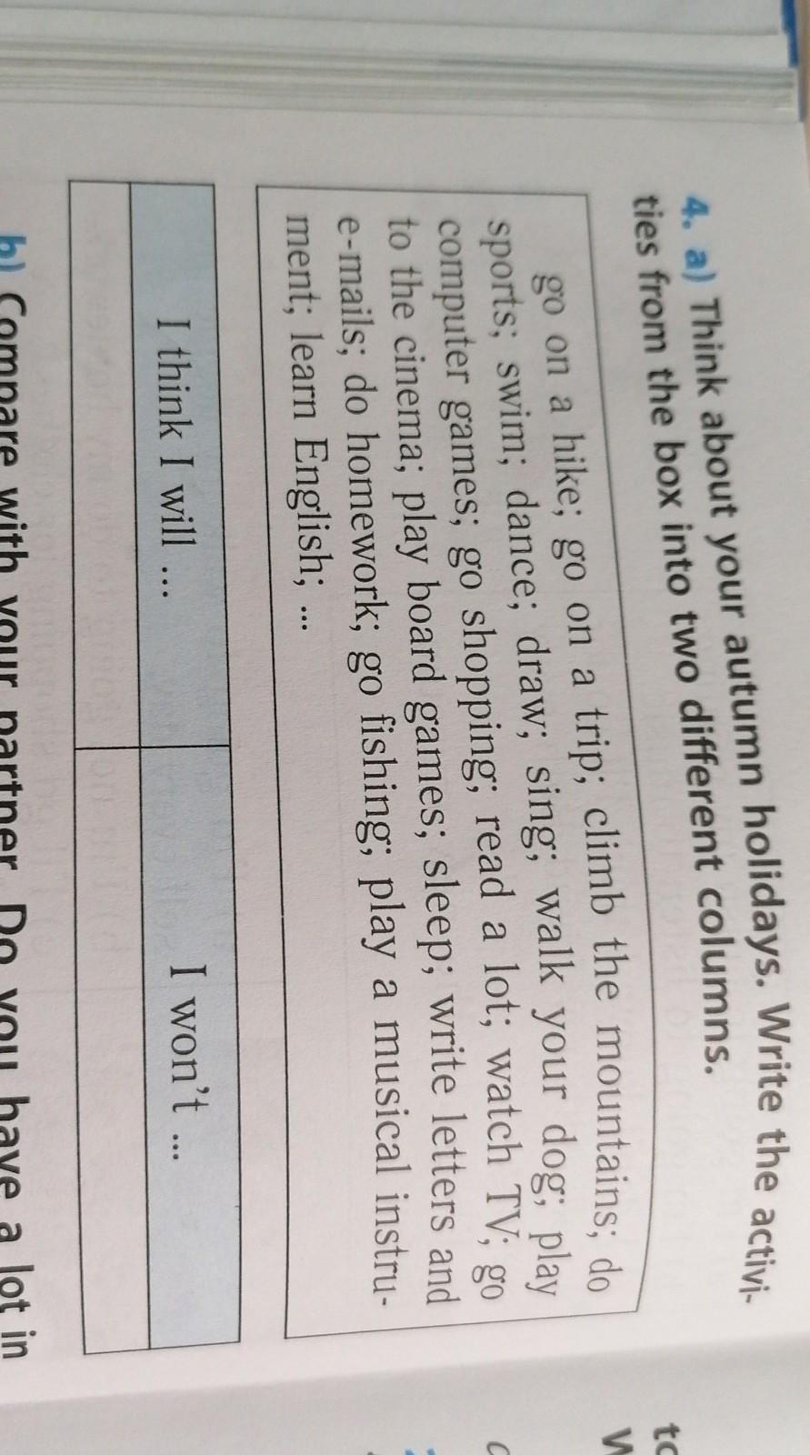 тут ты просто то должен/а написать что ты будешь делать на осннних каникулах,тут на твоё усмотрение,но к примеру:I think I will go on a hike;I won’t go on a trip