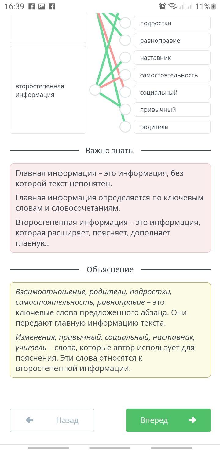 Какие из приведенных ниже слов можно отнести к главной информации предложенного отрывка, а какие – к второстепенной? Соедини верные варианты.