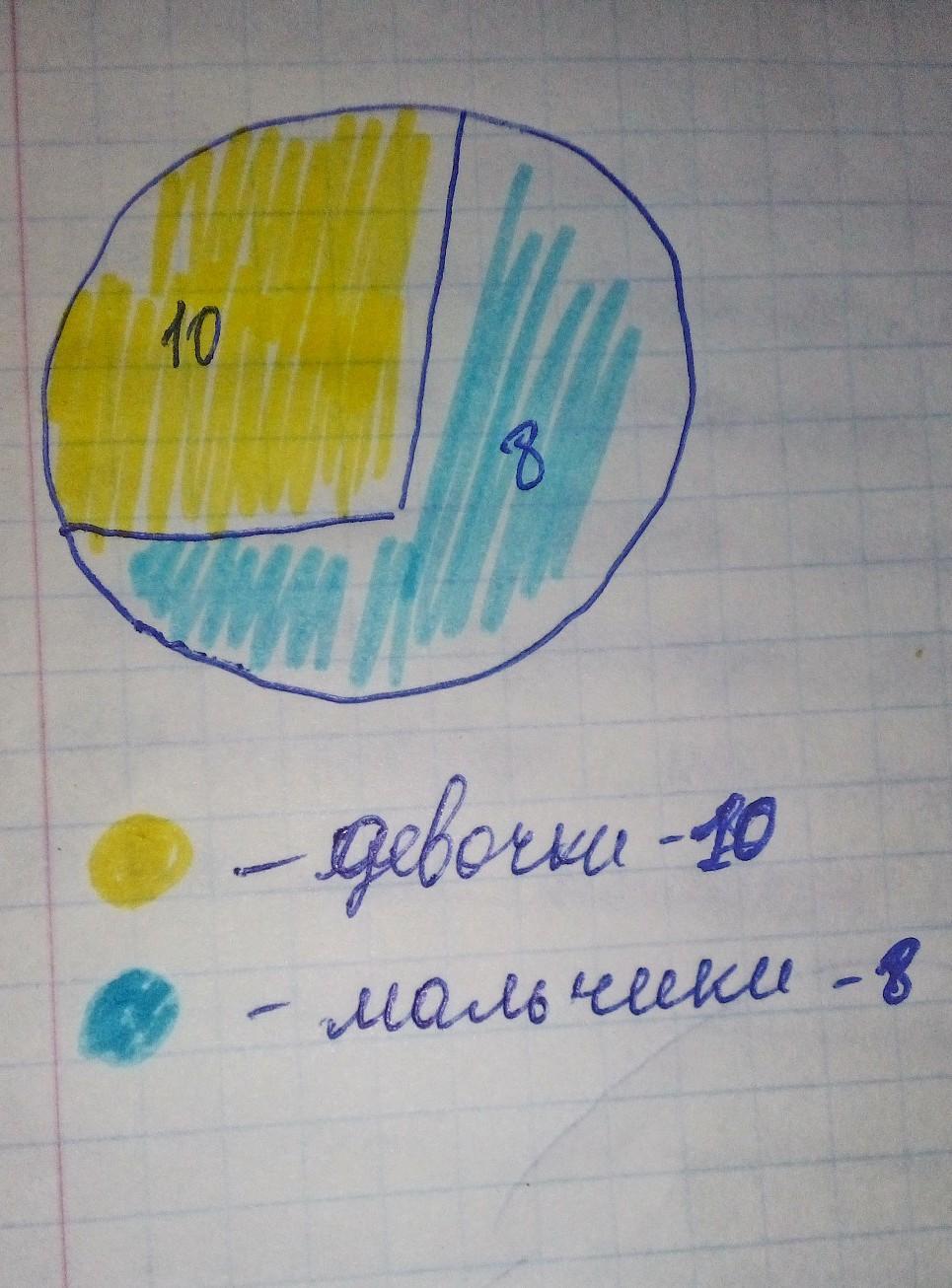 Помогите пожалуйста.Постройте круговую диаграмму,изображающую количество мальчиков и девочек вашего класса.Девочек 10,мальчиков 8