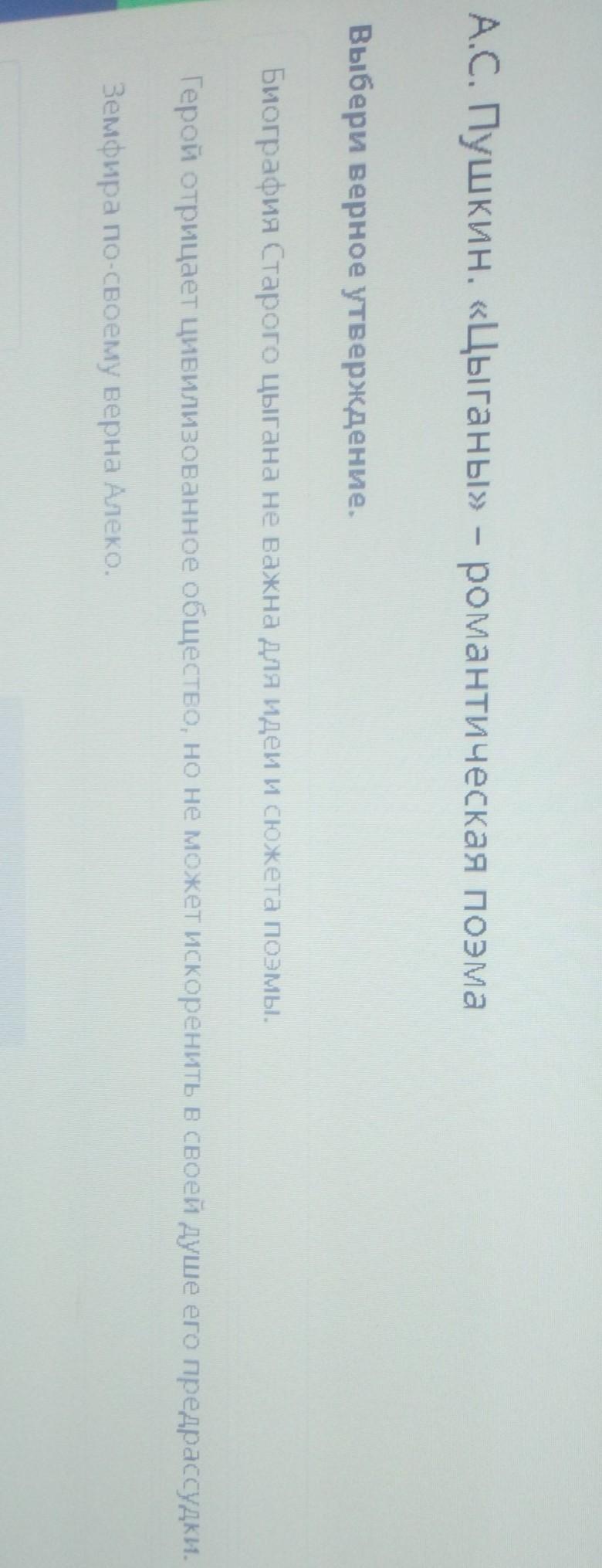 Выбери верное утверждение. 1.биография старого цыгана не важно для идеи и сюжет поэмы. 2.герой отрицает цивилизованное общество но не может искоренить в своей душе его предрассудки 3.Земфира по-своему Верна Алеко