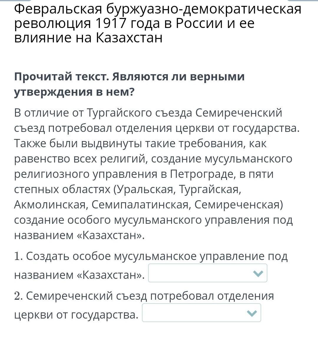 В отличие от Тургайского съезда Семиреченский съезд потребовал отделения церкви от государства. Также были выдвинуты такие требования, как равенство всех религий, создание мусульманского религиозного управления в Петрограде, в пяти степных областях (Уральская, Тургайская, Акмолинская, Семипалатинская, Семиреченская) создание особого мусульманского управления под названием «Казахстан».