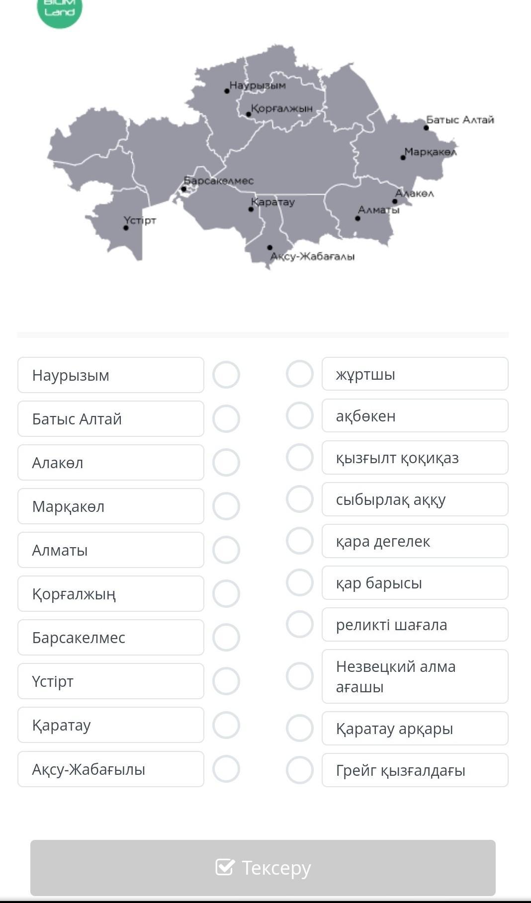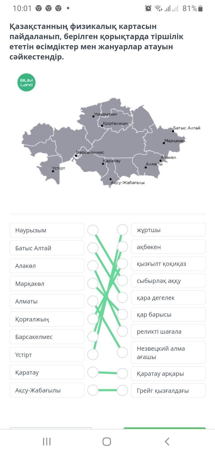 Қазақстанның физикалық картасын пайдаланып, берілген қорықтарда тіршілік ететін өсімдіктер мен жануарлар атауын сәйкестендір.