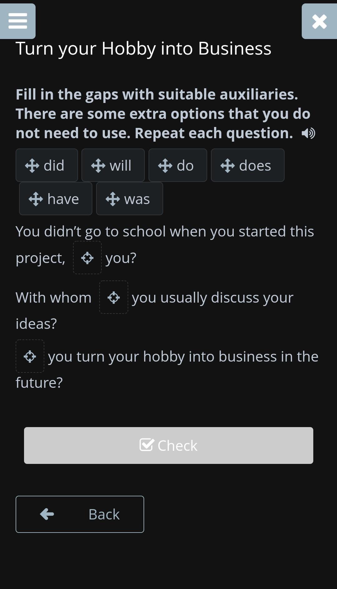 Fill in the gaps with suitable auxiliaries. There are some extra options that you do not need to use. Repeat each question