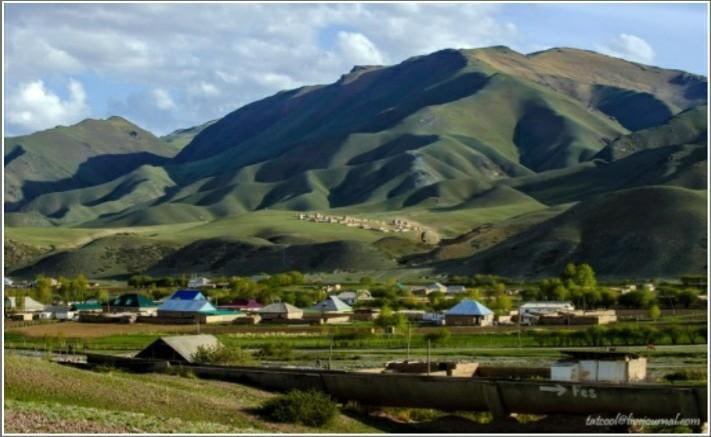 бұл өзені бар үлкен ауыл емес өте әдемі, фонда әдемі таулар көрінеді