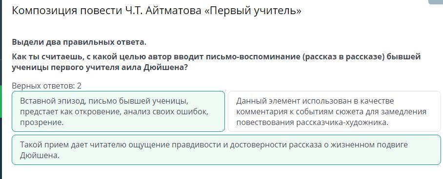 Как ты считаешь, с какой целью автор вводит письмо-воспоминание (рассказ в рассказе) бывшей ученицы первого учителя аила Дюйшена?