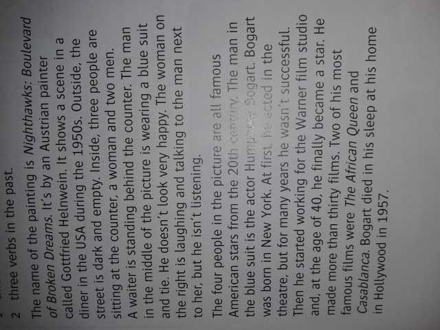 Такой перевод нормально? Название картины составляет Nighthawks: Бульвар разбитой мечты. Это австрийским художником под названием Готфрид Helnwein. Это показывает сцену в закусочной в США в 1950-х. Снаружи, на улице темно и пусто. Внутри, три человека сидят за прилавком, женщина и двое мужчин. Официант стоит за прилавком. Человек в середине картины носит синий костюм и галстук. Он не выглядел очень счастливым. Женщина на право смеется и разговаривает с человеком, рядом с ней, но он не слушает. Четыре человека в картине все известные американские звезды из 20 № r'tuiV. Человек в синем костюме является актер Ни т; .. "• '• •, • Sogart Богарт родился в Нью-Йорке Сначала я;.... Ти действовал в театре, но в течение многих лет он не был' т успешным Тогда он начал работать на киностудии Warner и, в возрасте 40 лет, он, наконец, стал звездой. Он сделал более тридцати фильмов. Две из его наиболее famous_films_were Африканского Queen