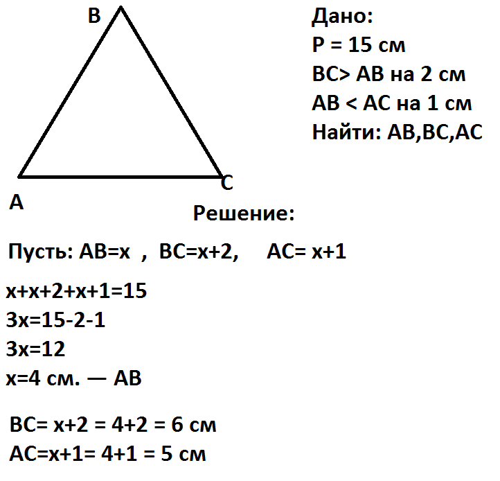 Периметр треугольника ABC равен 15 см.Сторона BC больше стороны AB на 2 см,а сторона AB меньше стороны AC на 1 см.Найдите стороны треугольника.