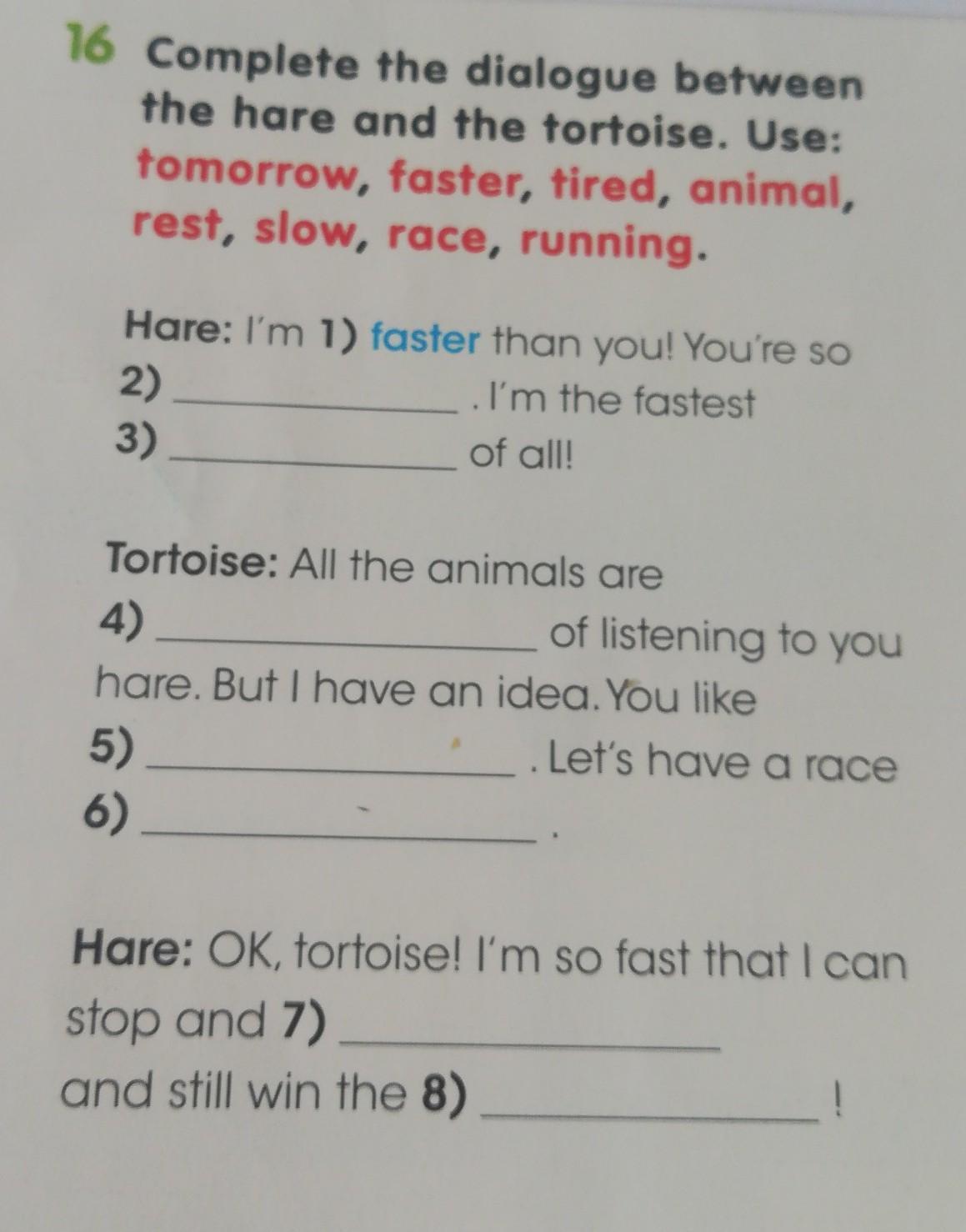 Complete the dialogue between the hare and the tortoise. Use: tomorrow, faster, tired, animal, rest, slow, race, running.