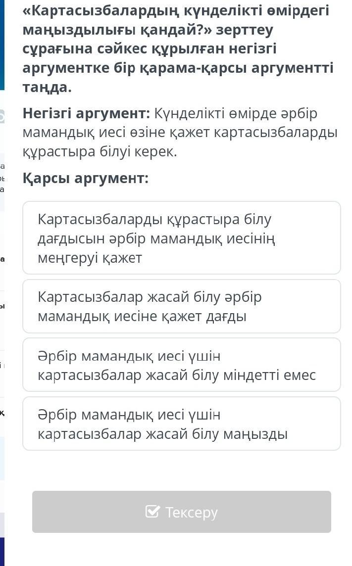 «Картасызбалардың күнделікті өмірдегі маңыздылығы қандай?» зерттеу сұрағына сәйкес құрылған негізгі аргументке бір қарама-қарсы аргументті таңда.
