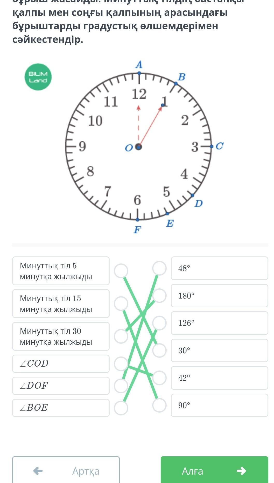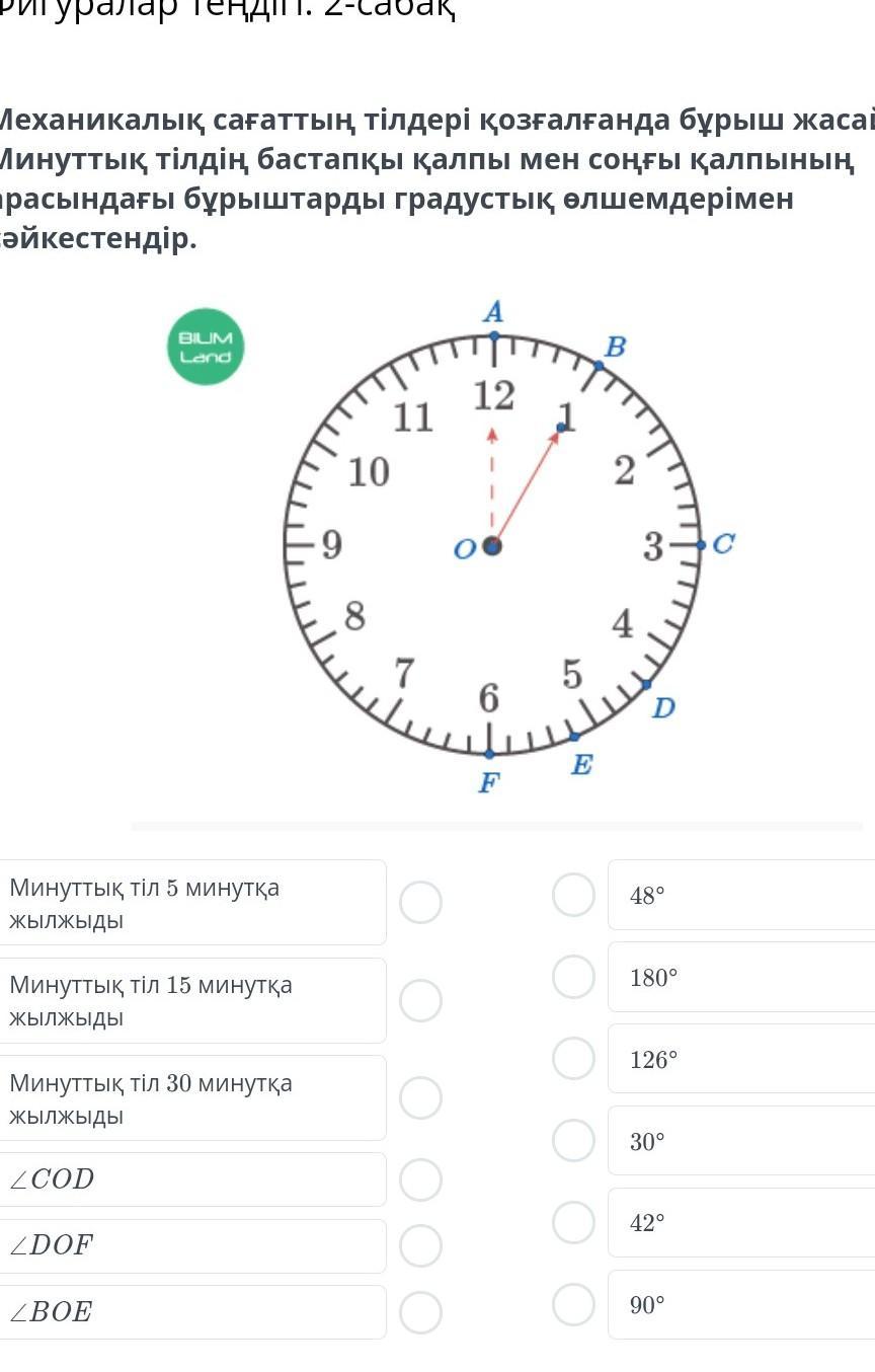 Механикалық сағаттың тілдері қозғалғанда бұрыш жасайды. Минуттық тілдің бастапқы қалпы мен соңғы қалпының арасындағы бұрыштарды градустық өлшемдерімен сәйкестендір. Отыныш айтындарш пжжжж