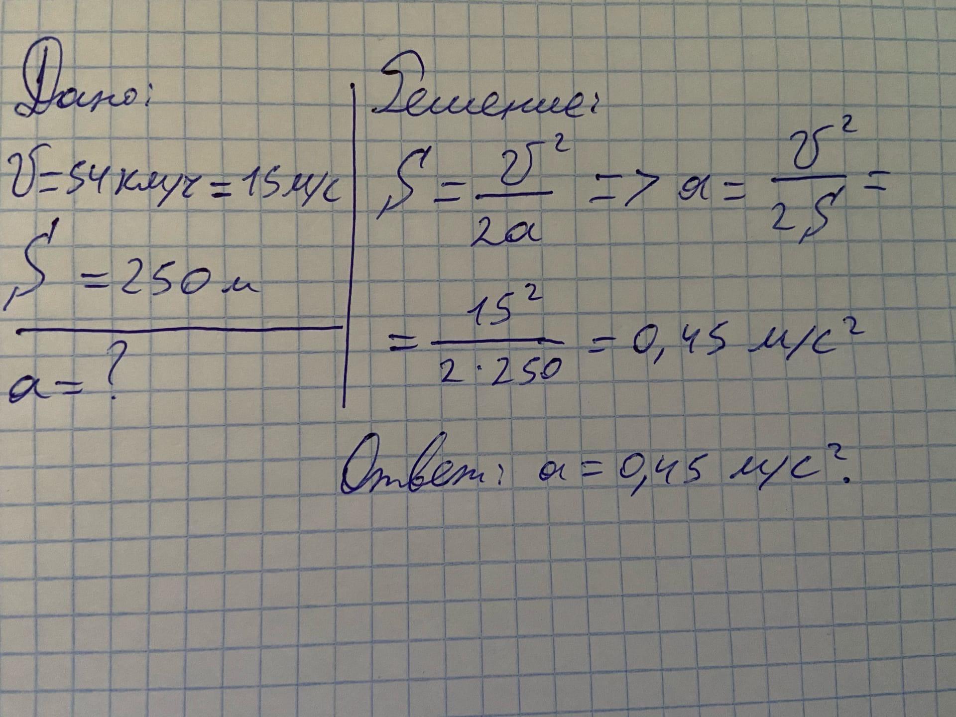a = (0² - 15²) / (2·250) = - 225 / 500 = - 0,45 м/с²