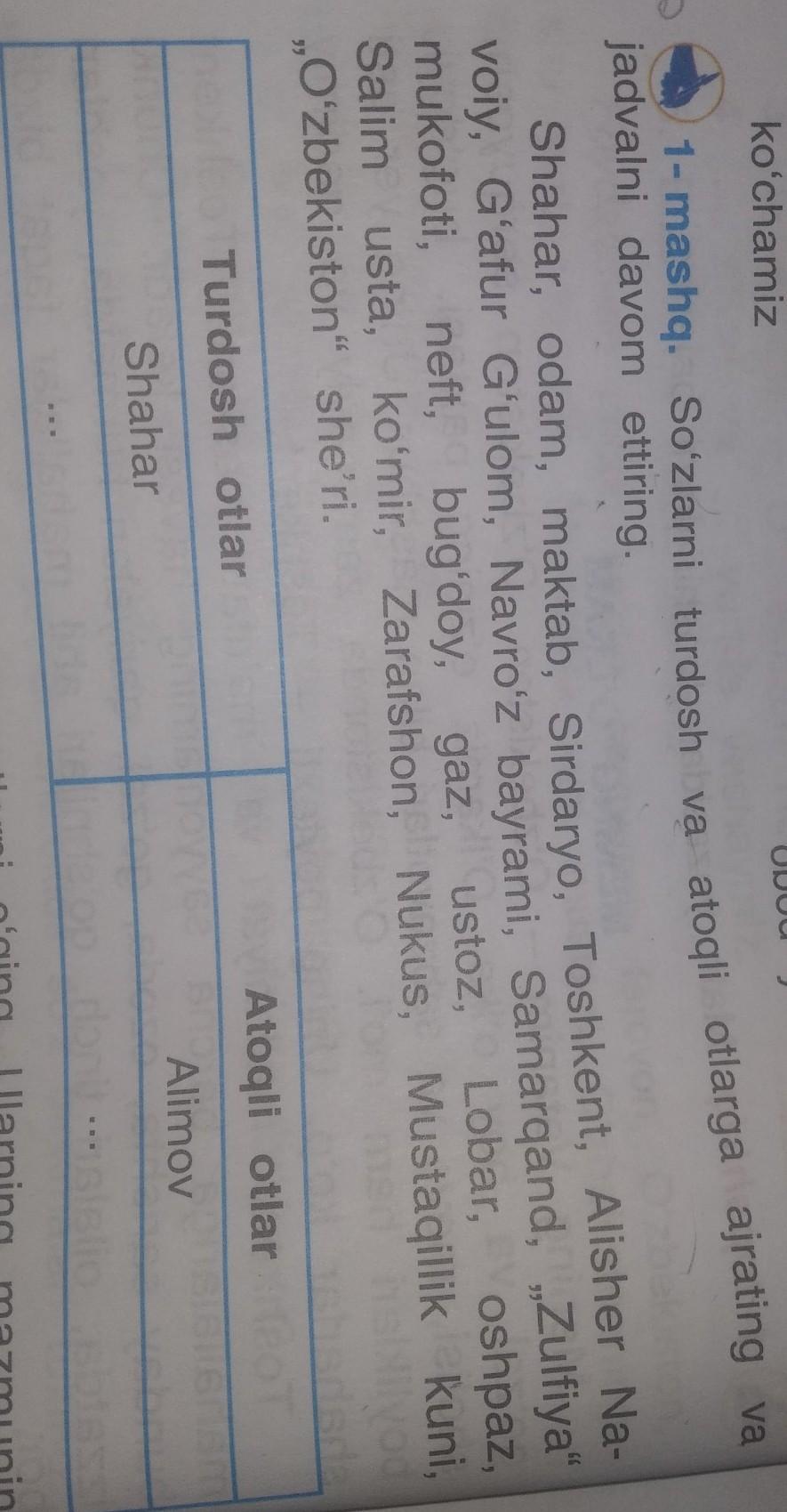 1-mashq sõzlarni turdosh va atoqli otlarni ajrating va jadvalbi davom ettiring 5 sinif 12bet
