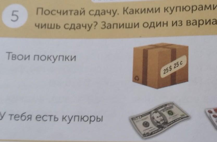 Посчитай сдачу. Какими купюрами и монетами ты получишь сдачу? Запиши один из вариантов.