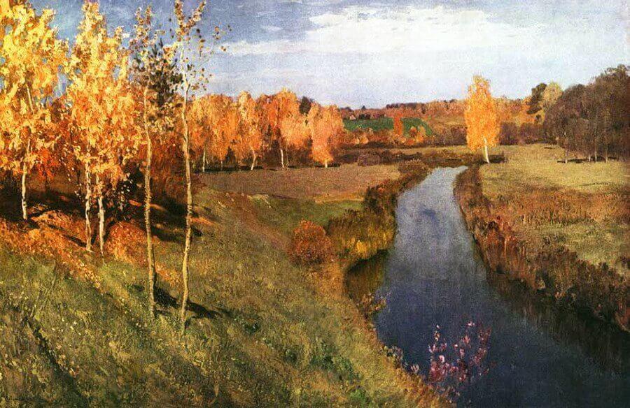 Картина И. Левитана "Золотая осень" передаёт все прелести и красоты природы осенью. Деревья переливаются золотыми, жёлтыми, оранжевыми оттенками. Трава усыпана листьями, что блестят на солнце. Речка чистая, отражает небо, белые облака. А другой её стороне берёзы, ещё не успевшие пожелтеть. Золотая осень, изображённая на картине, по истине чудесное время.