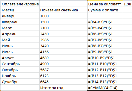 Построить электронную таблицу (в excel) «Оплата электроэнергии» для расчета ежемесячной платы за расход электроэнергии в течение года. Исходной информацией являются показания счётчика в начале каждого месяца и стоимость одного киловатт-часа.
