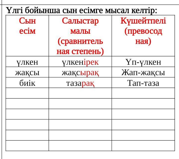 Кіші кішірек кіп кішірек арзан арзанырақ ап арзан қымбат қымбатырак қып қымбат таза тазарак таптаза биік биыгырек біп биік аласа аласарақ ап аласа одна просьба подпишись на меня и сделай лучший ответь