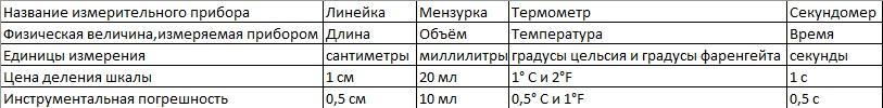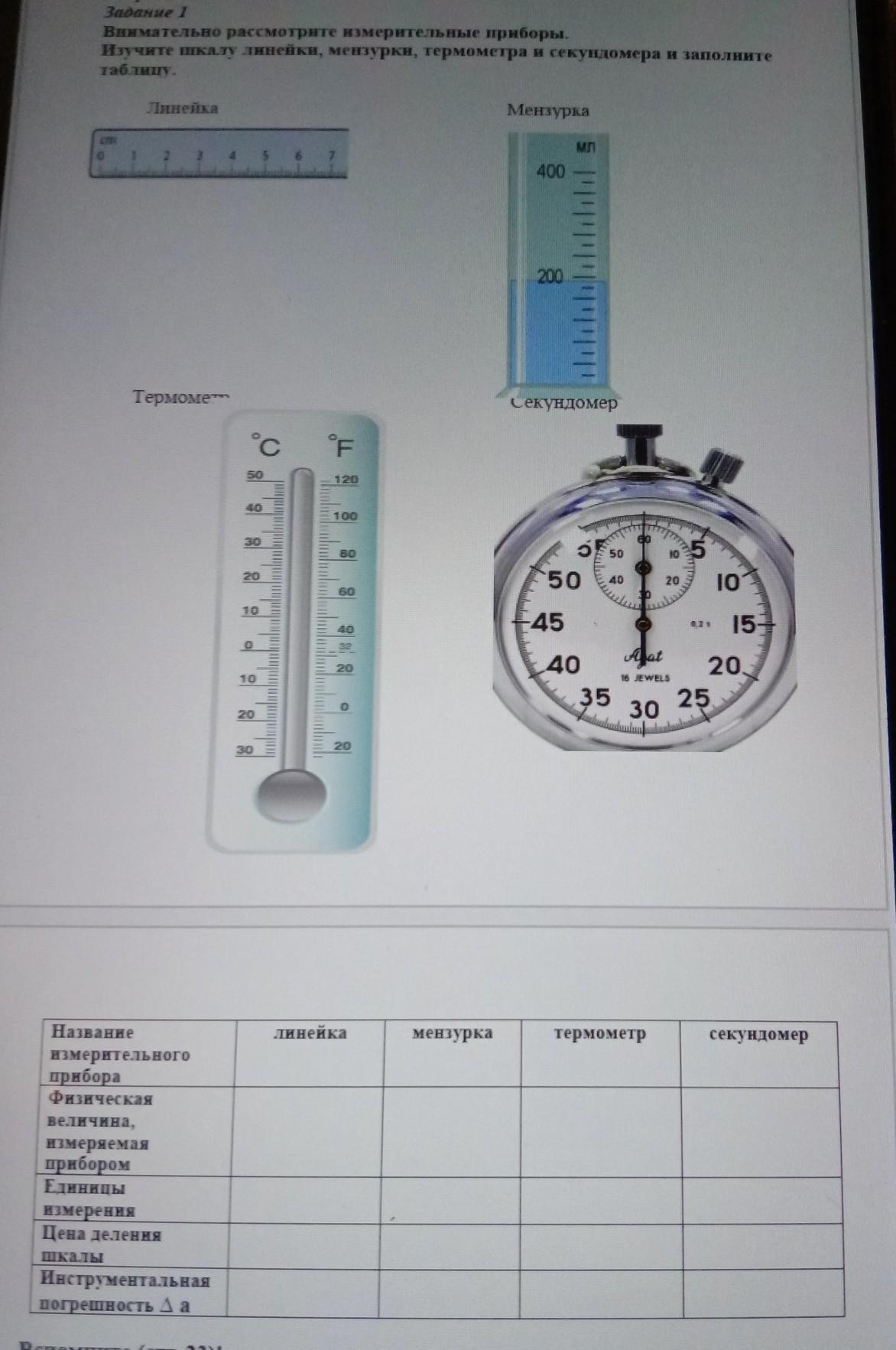 Изучите шкалу линейки, мензурки, термометра и секундомера и заполните таблицу.