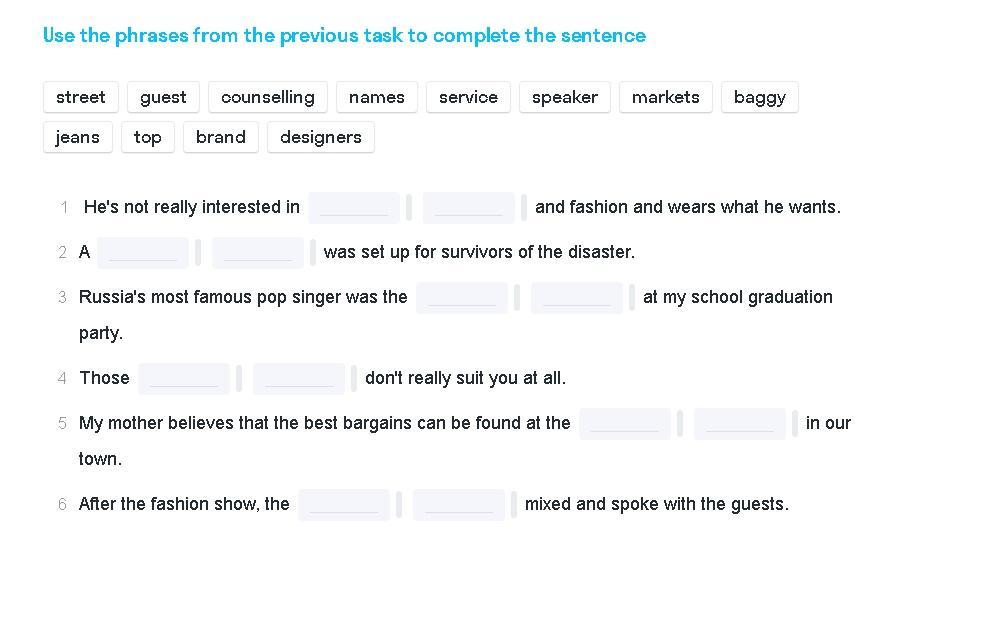 1-brand names 2-counselling service 3-guest speaker 4-baggy jeans 5-street markets 6-top designers