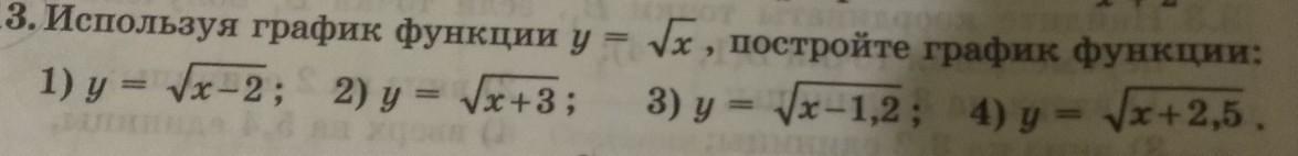 1) у = √х -2; 2) у = √х + 3: 3) y=√x-1,2; 4) у = √х + 2,5