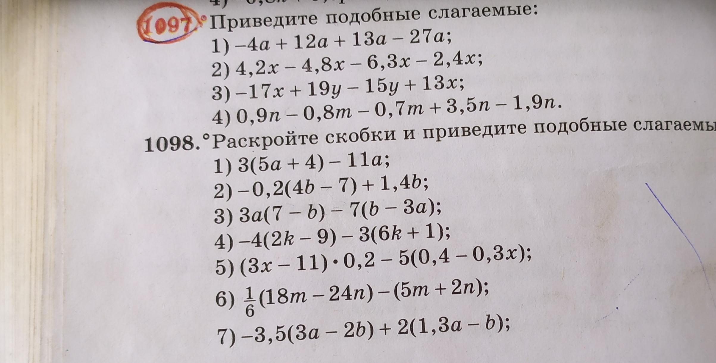 1097\\\\1) -4a+12a+13a-27a=-6a\\2) 4.2x-4.8x-6.3x-2.4x=-9.3x\\3) -17x+19y-15y+13x=-4x+4y\\4) 0.9n-0.8m-0.7m+3.5n-1.9n=2.5n-1.5m