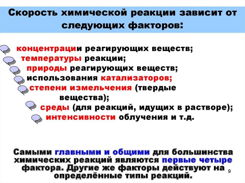 Объяснение: Скорость химической реакции принято называть изменение концентрации реагента или продукта в единицу времени. Зависит скорость от нескольких факторов:концентрация реагентов,природа веществ,температура,поверхность соприкосновения,катализатор.