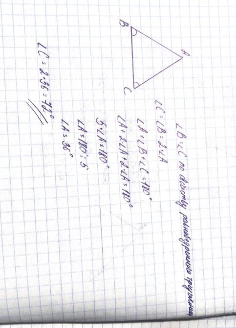 треугольник ABC равнобедренный с основанием BC угол a в 2 раза меньше угла B. Найдите величину угла при основании C. Срочно! С ответом, решением и чертежом. Даю 30 баллов (Просто нету уже)