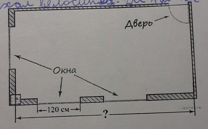 На рисунке изображён план комнаты. Ширина окна равна 120 см. Найдите чему примерно равна длина комнаты (на рисунке обозначена знаком вопроса). Ответ дайте в сантиметрах.