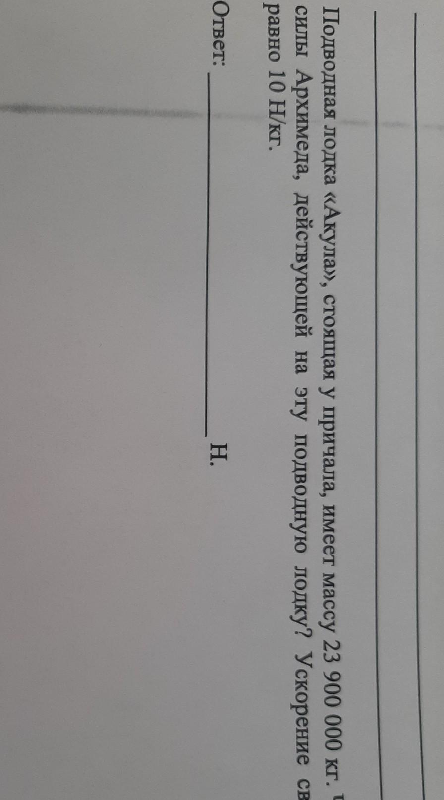 подводная лодка акула стоящая у причала имеет массу 23 900 000кг.Чему равен модуль силы Аохимеда,действующей на эту подводную лодку? Ускорение свободного падения ровно 10H/кг