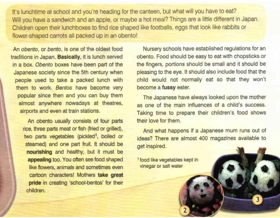 - It consists of four parts rice, three parts meet or fish, two parts vegetables and one part fruit.