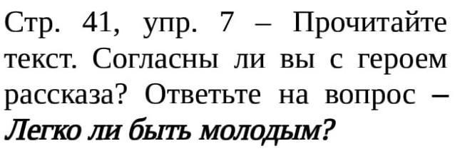 Стр. 41, упр. 7 – Прочитайте текст. Согласны ли вы с героем рассказа? Ответьте на вопрос – Легко ли быть молодым? помогите пж