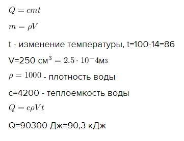 Какое количество тепла выделяется при остывании кипящей воды в емкости объемом 250 см3 до 14 ° C?