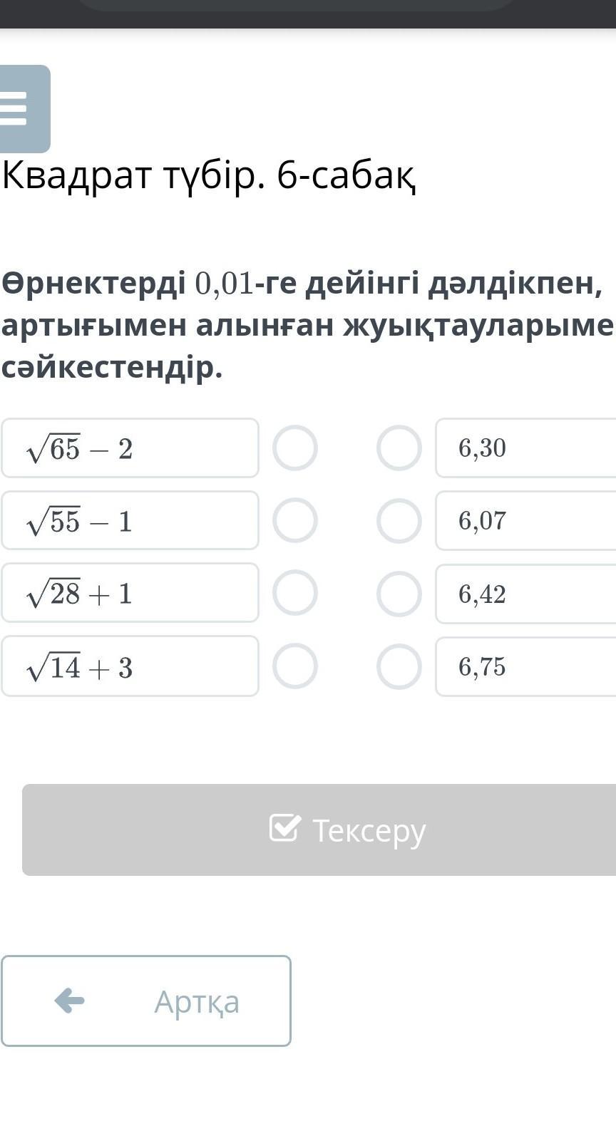 Өрнектерді 0,01-ге дейінгі дәлдікпен, артығымен алынған жуықтауларымен сәйкестендір.