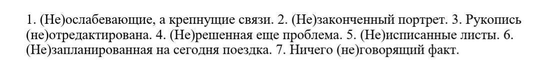 1. Не ослабевающие, а крепнущие связи. 2. Не законченный портрет. 3. Рукопись неотредактирована. 4. Не решённая ещё проблема. 5. Неисписанные листы. 6. Незапланированная поездка. 7. Ничего не говорящий факт.