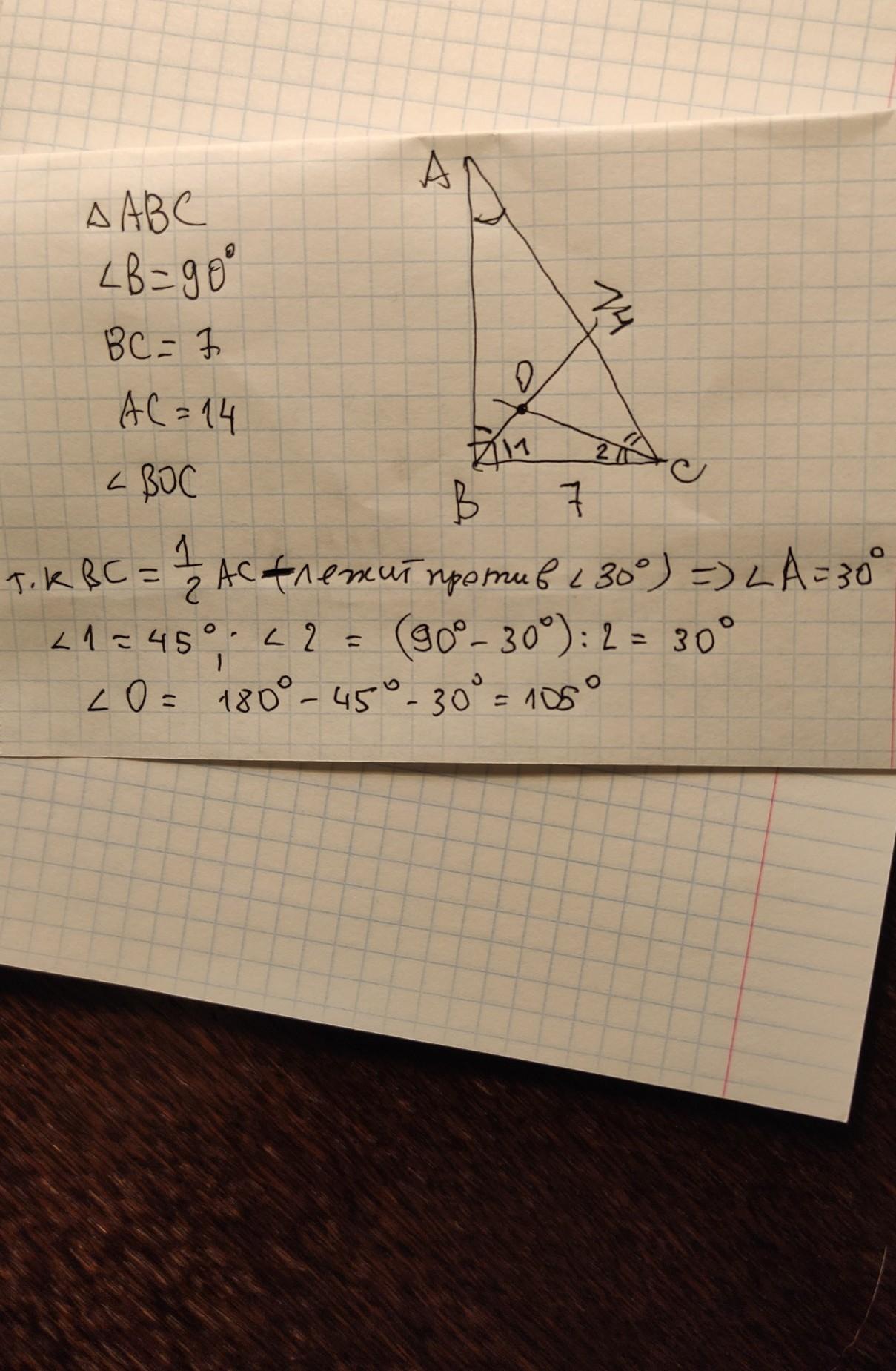 в прямоугольном треугольнике авс угол в прямой вс 7 ас 14 биссектрисы углов АВС и АСВ пересекаются в точке О.Найдите величину угла.ВОС.Ответ дайте в градусах